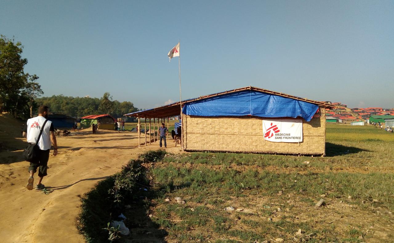Entonces seguimos el recorrido a la segunda posta de salud. Son todas muy parecidas, pero lo lindo de la segunda y la tercera es caminar hasta ellas porque están en la parte elevada del campamento. Al lugar en donde llegaron estas 500.000 personas en 2 meses desde Myanmar, es un terreno irregular con muchas partes planas donde hay cosechas de arroz y muchas partes elevadas donde solía haber árboles y cañas de bambú que claramente usaron para armar sus casas y hoy no queda casi ninguno y son una gran mini ciudad con mini pasillos en un terreno irregular. En cada posta hacemos lo mismo, es lindo ver sus caras cuando nos ven llegar y cuando los apoyamos en su trabajo. Es muy importante empoderar a estas personas en lo que están haciendo, motivarlos, apoyarlos y capacitarlos para que lo hagan cada vez mejor. Pero no hay nada como caminar por el campo. Ver a los niños corriendo, bañándose en las bombas de agua que bombean manualmente agua de no sé cuántos metros para abajo, las casas con algo de humo porque están cocinando adentro (sisi adentro de la casa de plástico y bambu, pero hay costumbres que no ceden), los hombres cargando 20 veces su peso en la espalda, algún que otro kiosquito colorido, y las mujeres tapadas que por momentos se asustan de Enoch porque claro, nunca habían visto a un hombre negro y de semejante tamaño en su vida. Ser blanca y con el pelo destapado aunque en un rodete también se lleva varias miradas, pero miradas de timidez, de inocencia y alguna que otra sonrisa. El recorrido entero lleva 5hr o 6hrs, y creo que son unos 5km o probablemente más pero entre las subidas y bajadas es muy difícil de contar.
